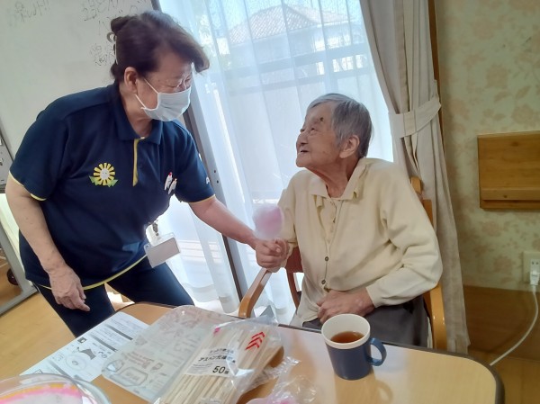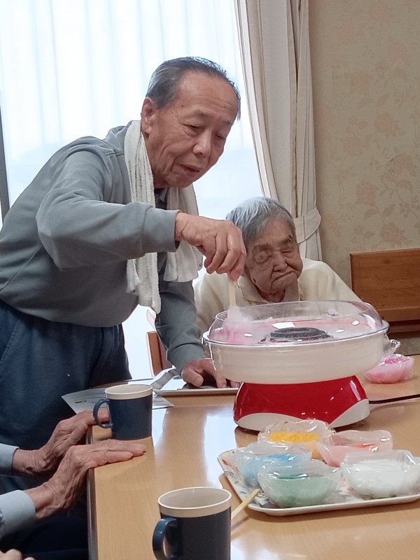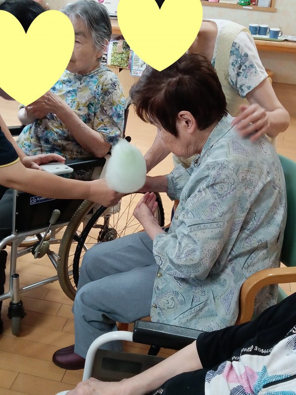 お祭りの屋台に行ったような気分を味わっていただきたく、今回は綿あめ作りを提案しました(*´ω`*)