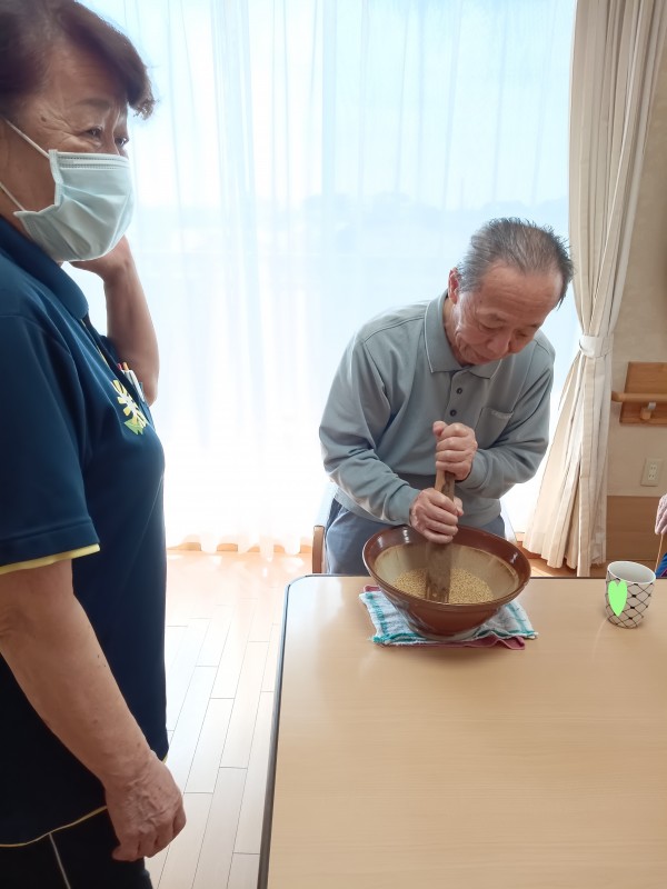 うどんにいれるすりごまをご利用者様にすって頂きました。