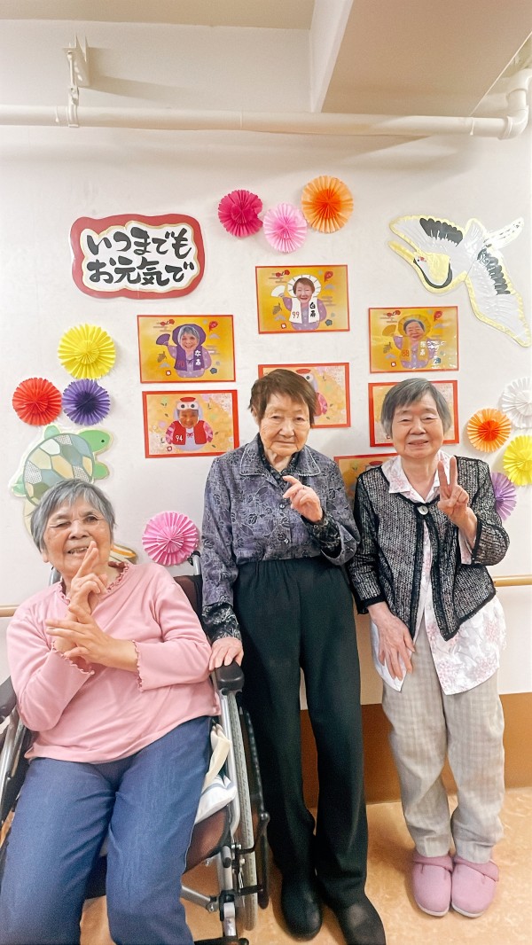 99歳(白寿)のB様、90歳(卒寿)のA様、88歳(米寿)のM様はちゃんちゃんこを着ています♡
