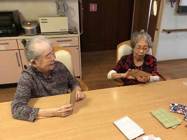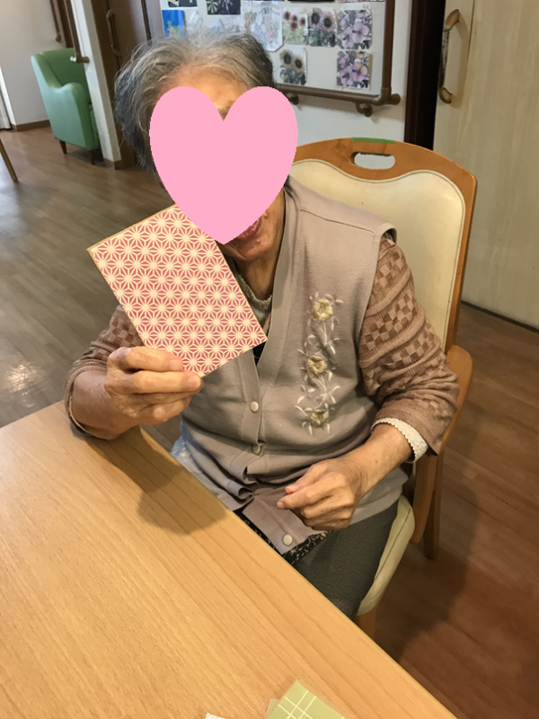 段ボールに柄付きの折り紙を貼って作ったカードを使って