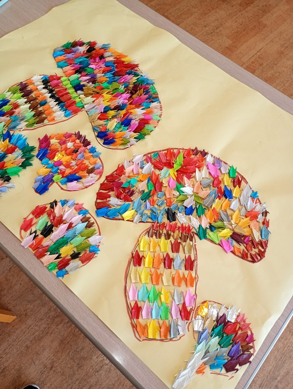 物凄い集中力で大量の鶴を折り、きのこの下書きの上に貼り付けていました♡♡♡