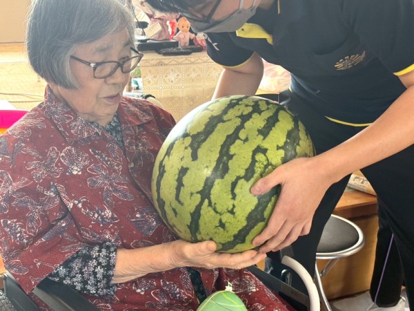 普段杖歩行のI様ですが職員付き添いのもと、一歩一歩しっかりスイカへ近づかれ