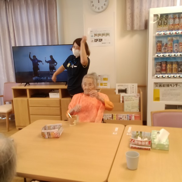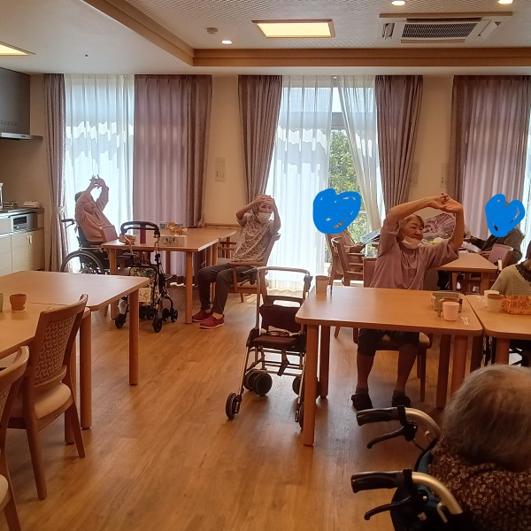Tです。今日は1階の利用者様の昼食前の体操風景のご紹介です。
