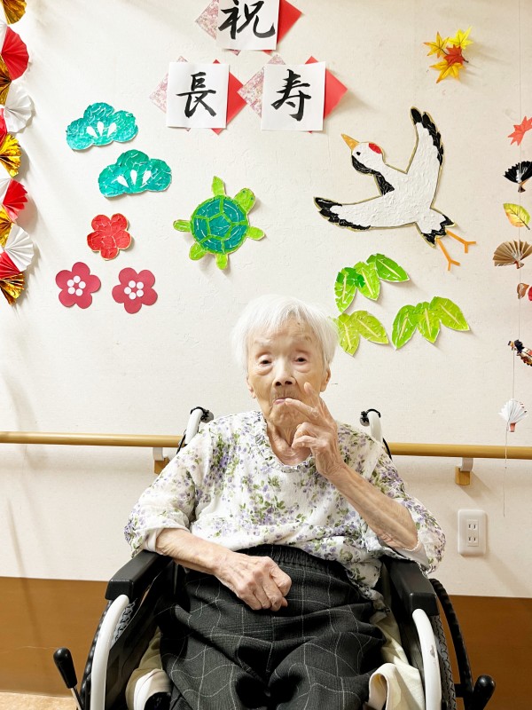 車椅子のK子様は、今年で98歳を迎えられました。施設では2番目にご長寿で、元気にピースサインをしてくださいました。