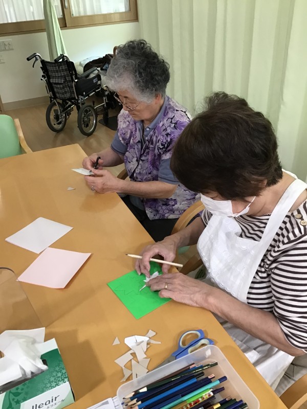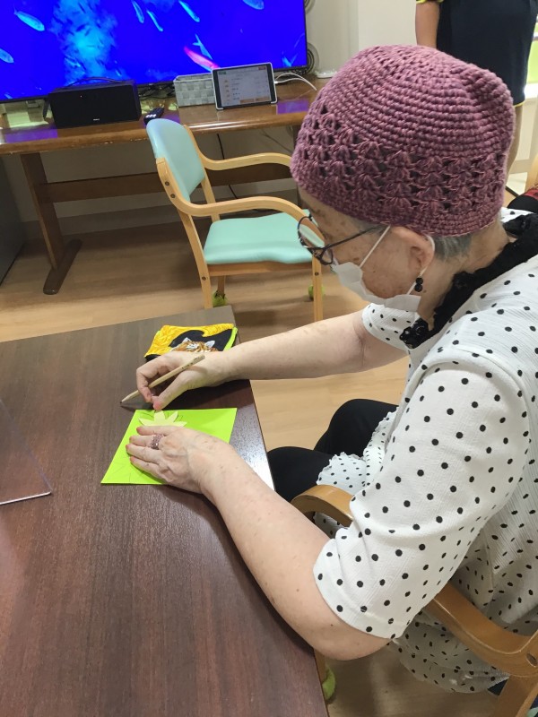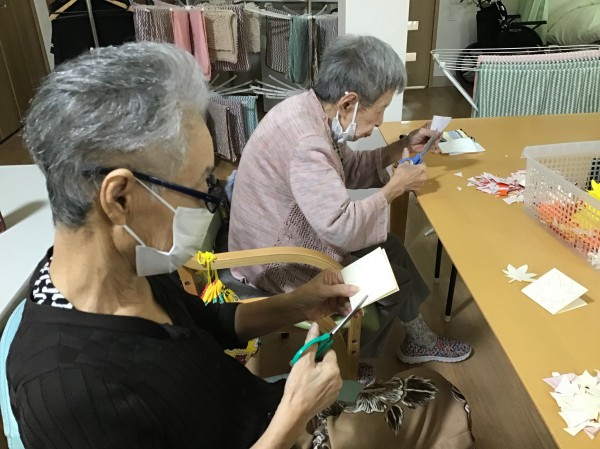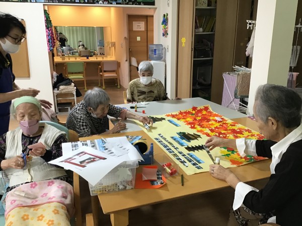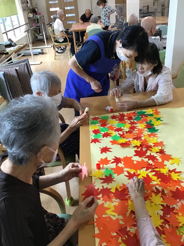 そこでかたくりでは一足早く秋を楽しめるようにとクラフト活動で紅葉の景色を作りました。