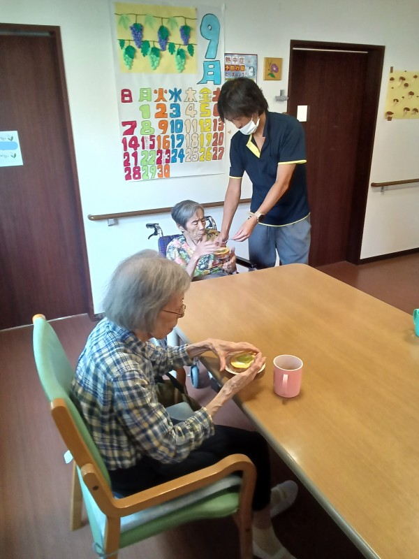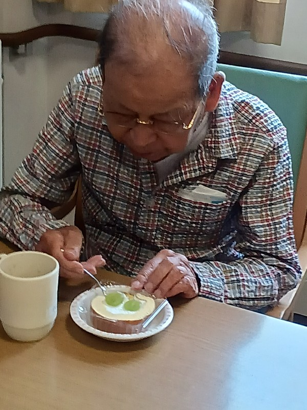 今回のスイ-ツは入居者様のリクエストと季節のフルーツを組み合わせたシャインマスカットのロールケ-キとさせていただきました