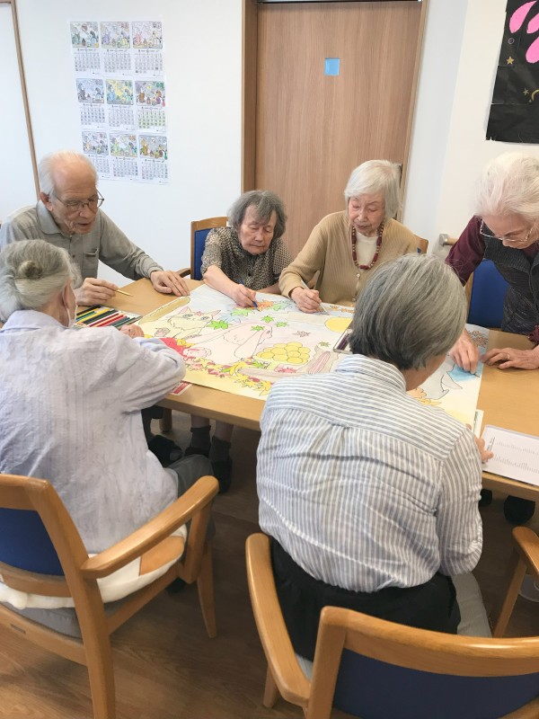 「この絵を見るとホッとした気持ちになるの」や「この絵があると雰囲気が明るくなるね」「ピンクのウサギがかわいい」と感想を言って下さいます!皆様で協力して作った作品でそのような気持ちになって下さるなんて素敵ですね(*^▽^*)スタッフも嬉しい気持ちでいっぱいです♪