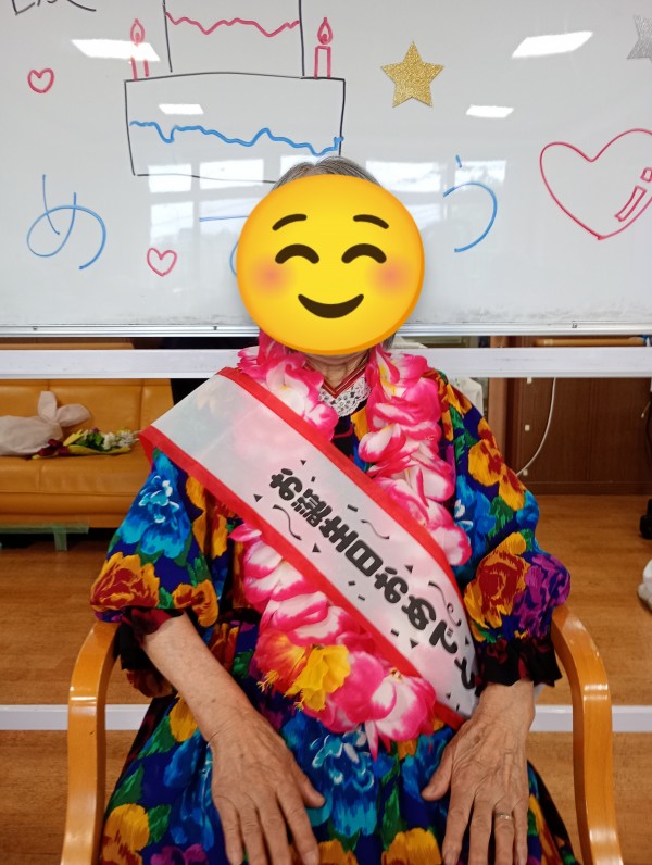 お誕生日のこちらのご利用者様、主役にふさわしい飾りを身につけてお祝いされる準備もばっちり!!