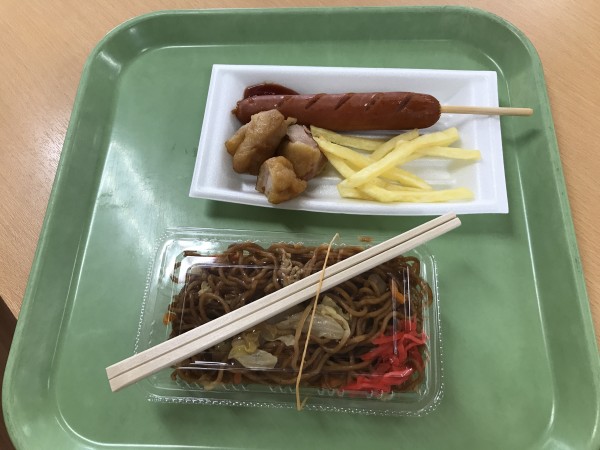 焼きそば、から揚げ、フライドポテト、フランクフルト