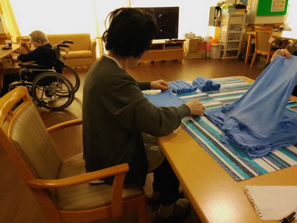 とある日の午後、ホールで職員がおしぼりを巻いていると
