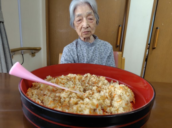 各ご利用者様の座席へと行き皆様にしゃもじを持っていただき混ぜていただきました。