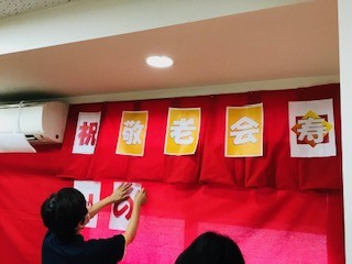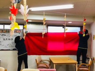 まずは、真っ赤な布で飾り付け♪(^^♪