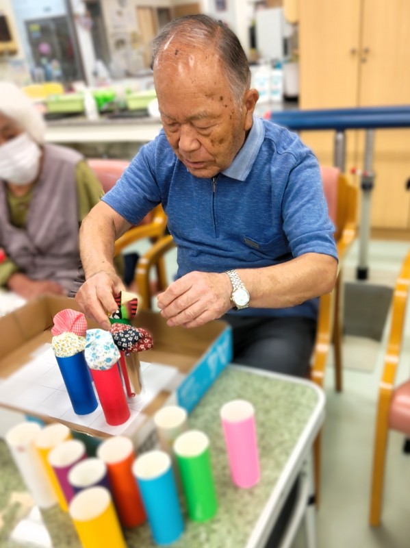 制限時間内にお手玉を乗せたペーパー芯をマス目に並べていくというもの。