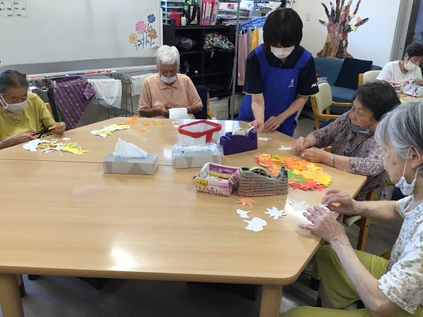 暑かった猛暑の夏もひと段落をし、デイサービス内では背面のフロア飾りを秋の季節へ替えていきます。