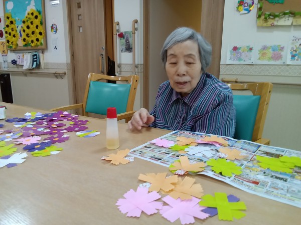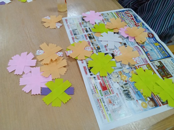 ご利用者様に色とりどりのコスモスの花をたくさん作っていただきました。