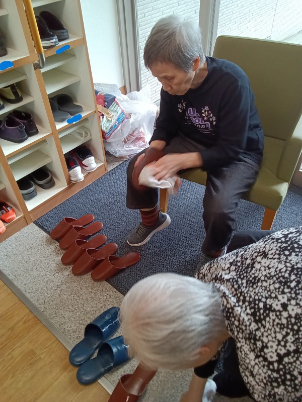 先日、ご利用者様と環境美化の一環で来客用のスリッパを綺麗に拭きあげました。