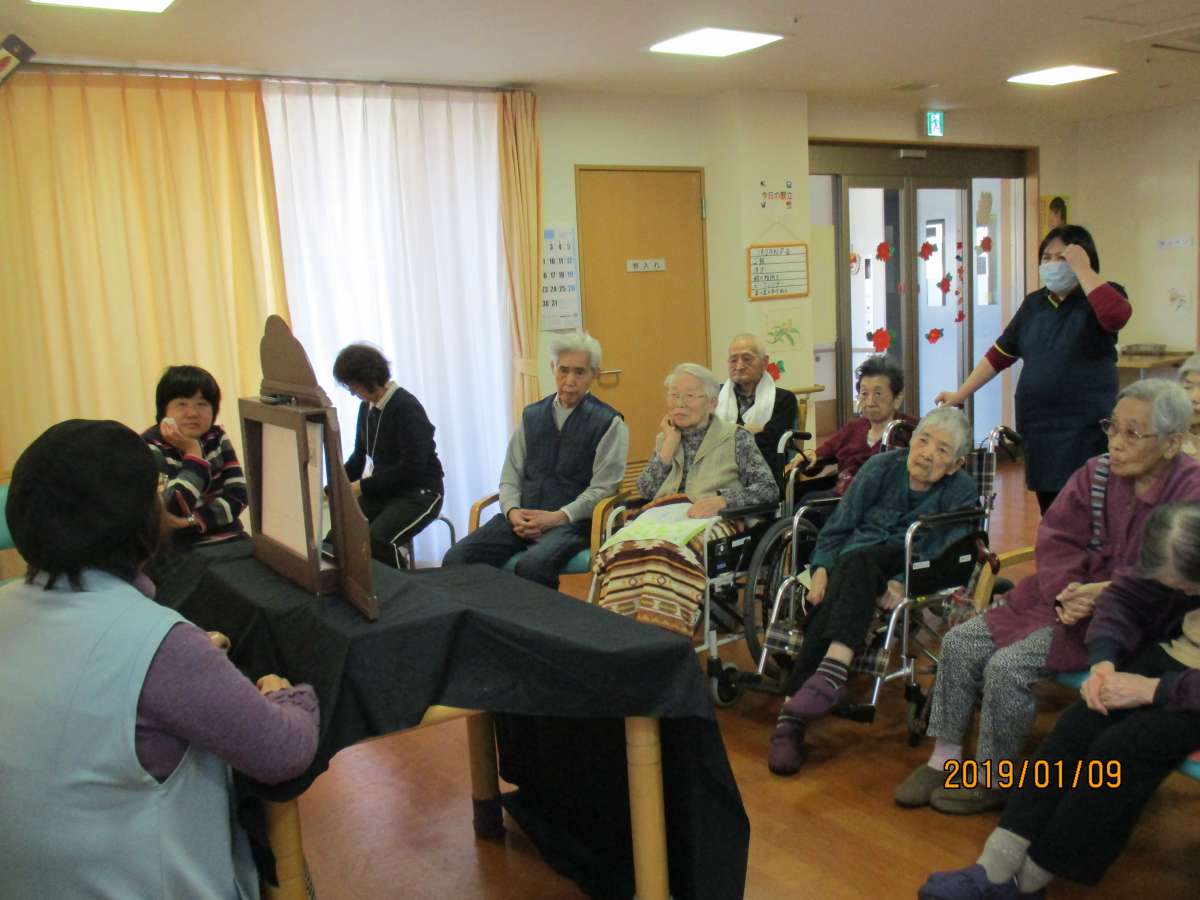 1月9日 ボランティアさんの紙芝居がありました。今回は、いつもと違い途中で、手遊びゲームを入れてくださいました。紙芝居を楽しんでおられました。