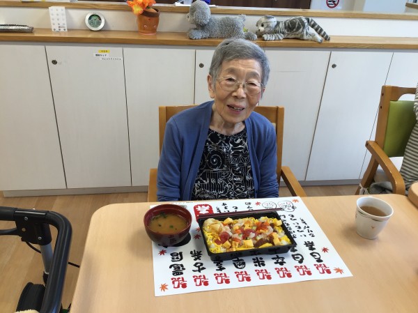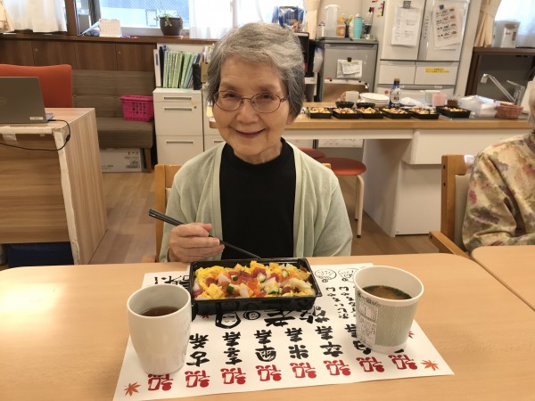 そう!お寿司♪皆さんに「何が食べたいですか?」とお聞きすると「お寿司が食べたいねー」と圧倒的大多数でリクエストNO1なんですよ♪ 今回は敬老会のお祝いで握りも良いけれど食べやすいバラちらしが昼食に並びました。