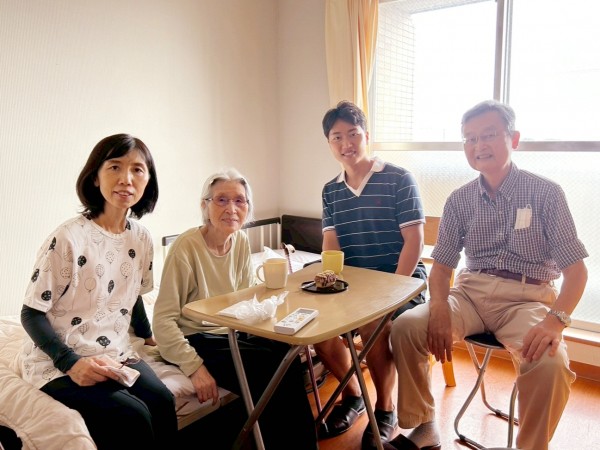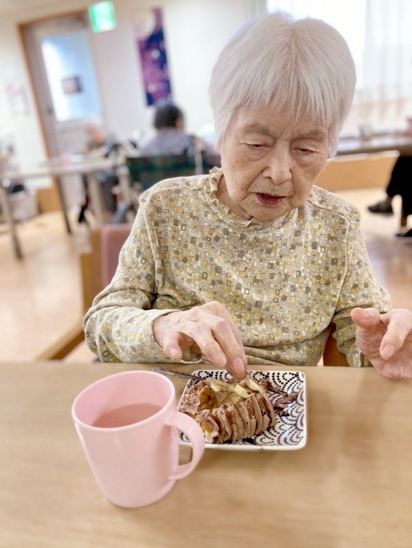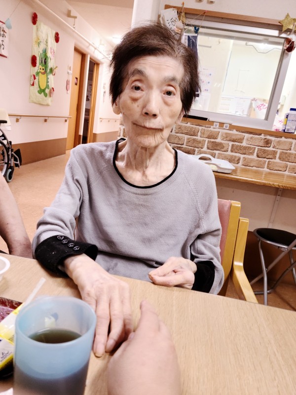 「美味しいですか?」とホーム長に声を掛けられ、ゆっくりと頷き握手を求めるT様。