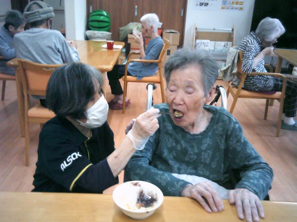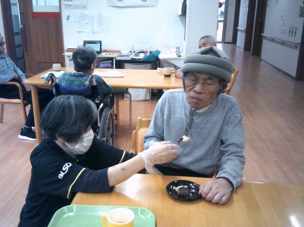 おはぎを召し上がられています( ^ω^)・・・ 餡子ときな粉の2種類を作りました。 美味しいね! 作ってくれたの?