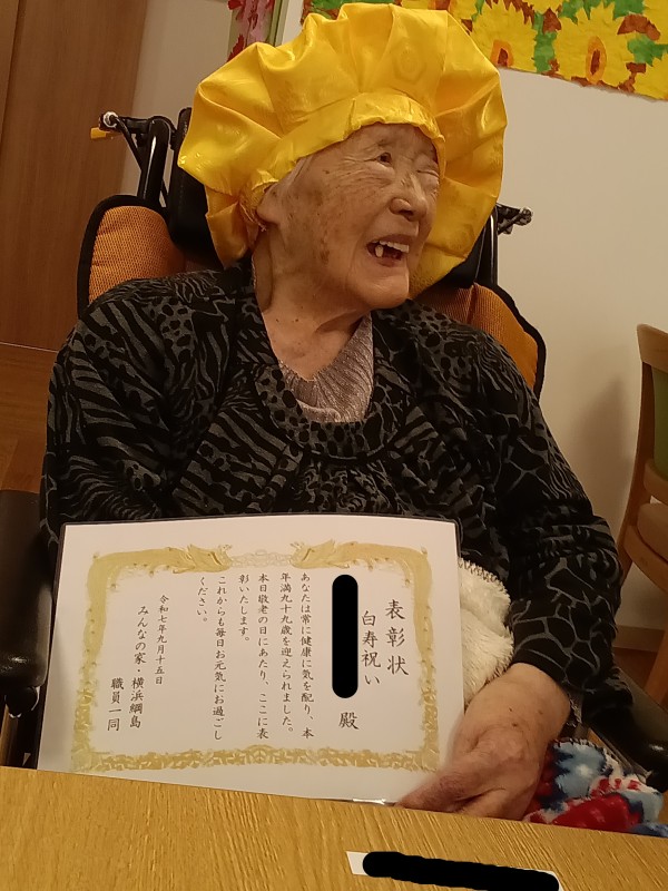 I様はなんと御年99歳♪白寿のお祝いに、こちらも表彰状のお渡しと記念撮影をさせていただきました♪