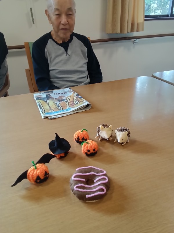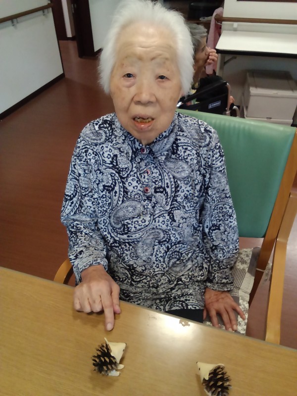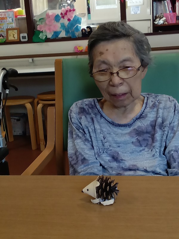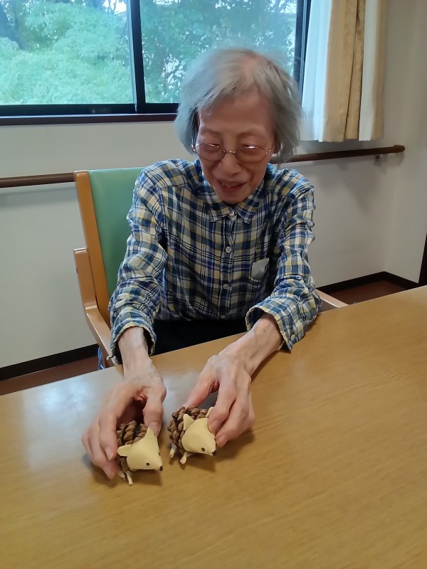 我がNo1.手芸マスターのスタッフが松ぼっくりで制作したハリネズミが入居者様に大好評で笑顔をいただきました
