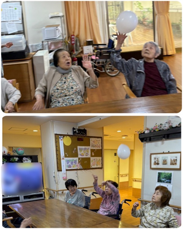 この日のレクリエーションは東西フロア、軽い運動も兼ねて楽しめる風船バレーを行いました