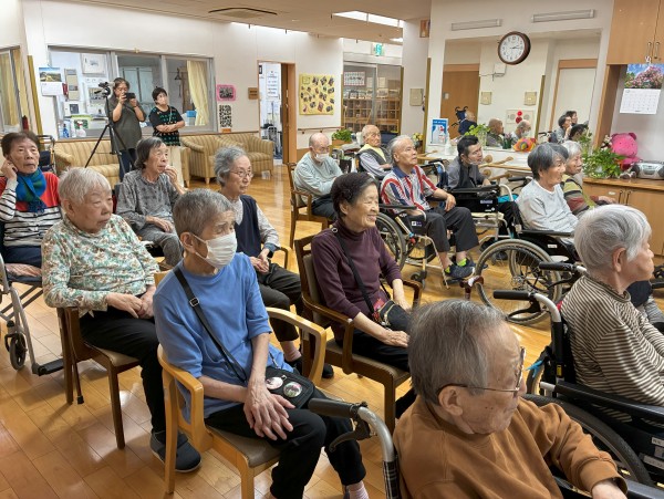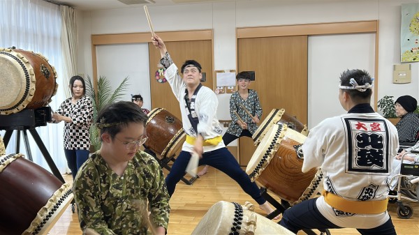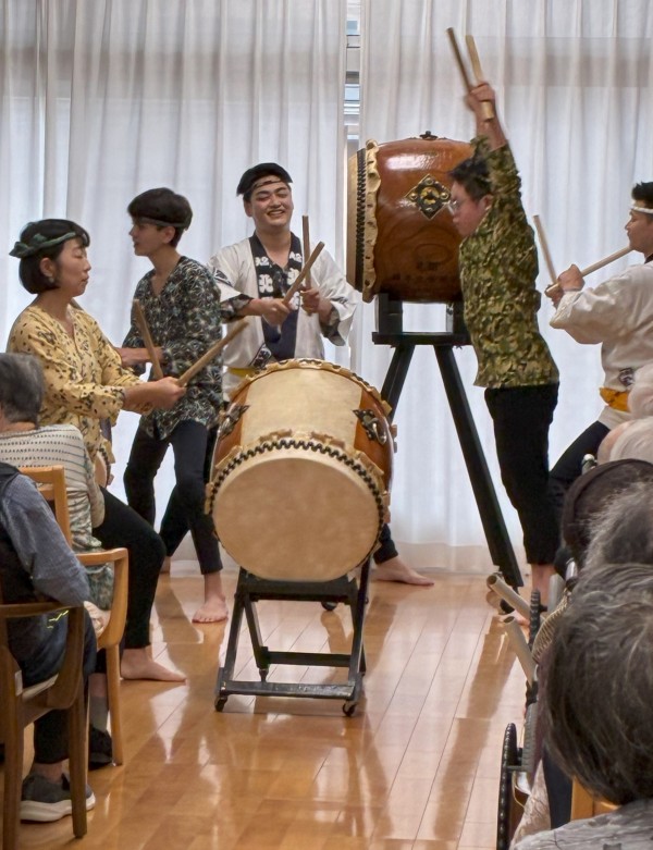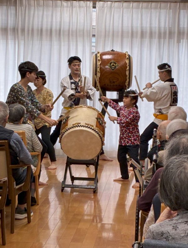 入居者様の数名は太鼓をセッティングしている時から見学されていて、小さなお子さんが手慣れた様子で器材を運んでいる様子を見て「すごいねー」「偉いねー」と感心されていました。