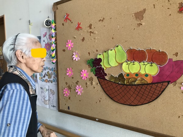 先日みなさんと秋の野菜や果物の絵を切って掲示しました♪