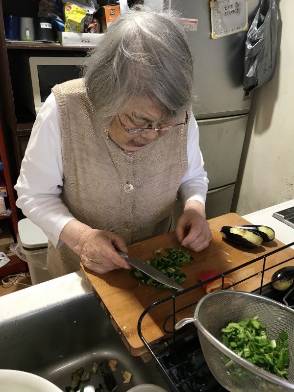 ご利用者様にも手伝って頂き、野菜を賽の目に切ってから油で炒めて砂糖と味噌で味付けしました♪