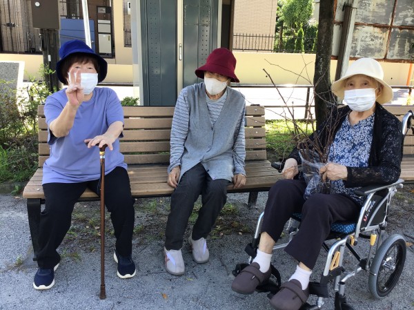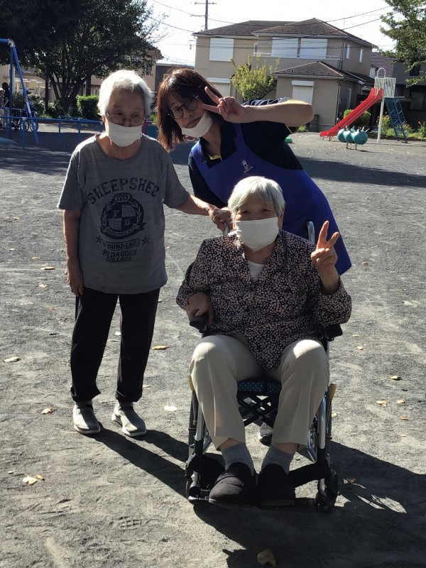 午後のお散歩は午前中とは違う公園に利用者様全員でお出かけです♪歩くのが大変な方は車椅子で移動です。