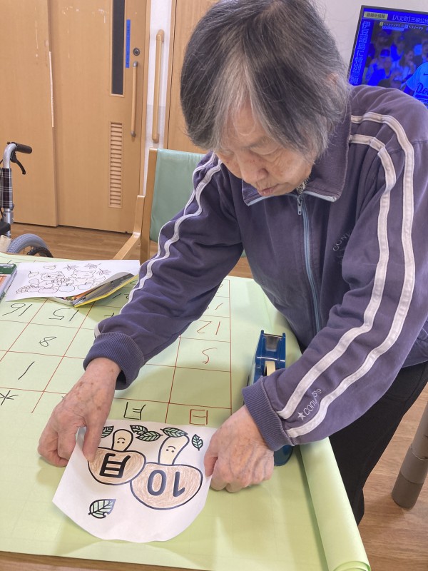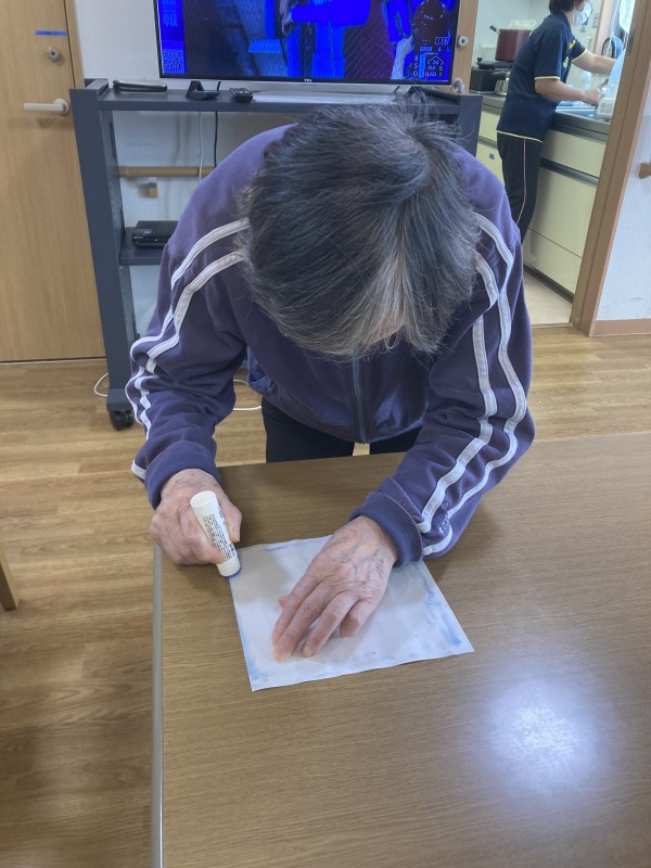 そして次は秋らしい塗り絵を用意し塗分けていき、貼り付けていきます。