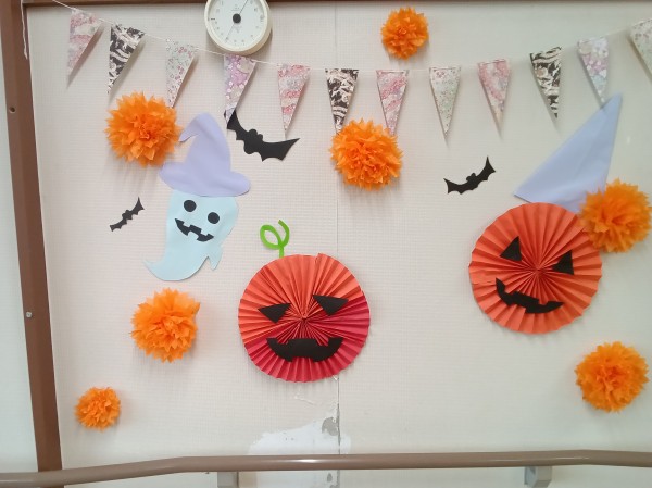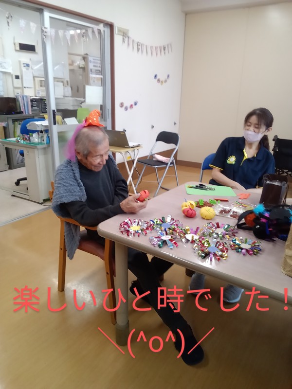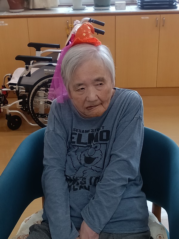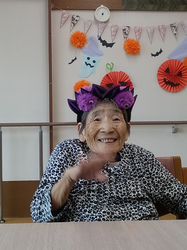 本日はハロウィーンの準備をしていて被り物を出してみるとご入居者様から被り物を見て被りたいと要望がありハロウィーンではないのですが、被ることで皆が盛り上がってしまいご入居者様とハイポーズで写真を撮ってみました。