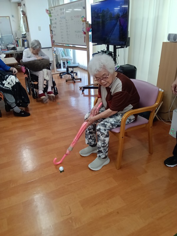ゴルフボールがカップに入って、ペットボトルが起き上がると