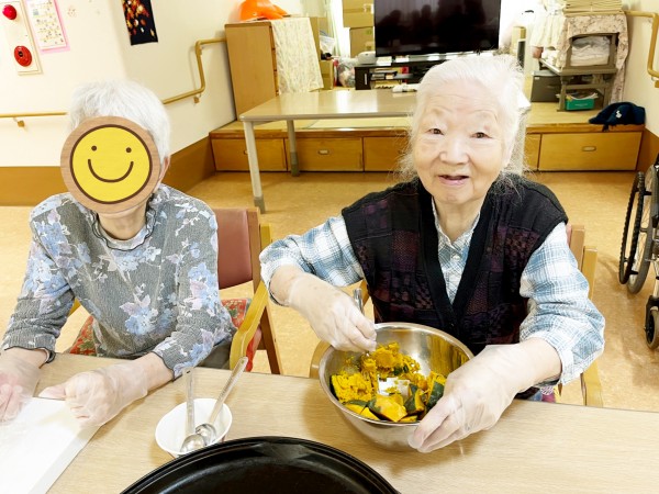 グループホームみんなの家大宮三橋 3階10月おやつレク~皮も美味しいから捨てません♪エコで美味しい『皮付きカボチャ餅』