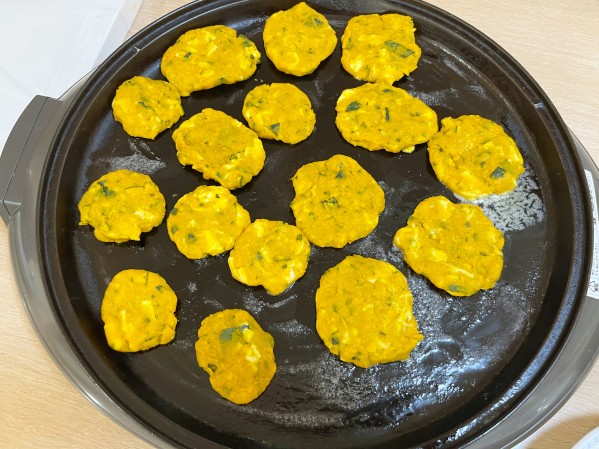 ホットプレートで焼き始めると、カボチャとチーズの香ばしい匂いが広がります。焼き色がついてくると、「それは私の!」「一番大きいのはおれのだ!」と、F様やF男様が楽しそうに声を上げ、笑い声が絶えません。