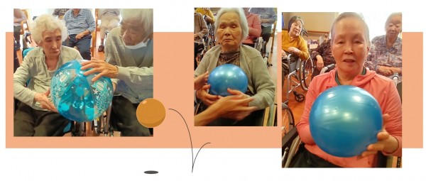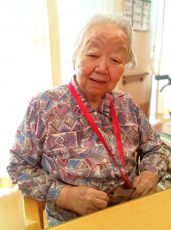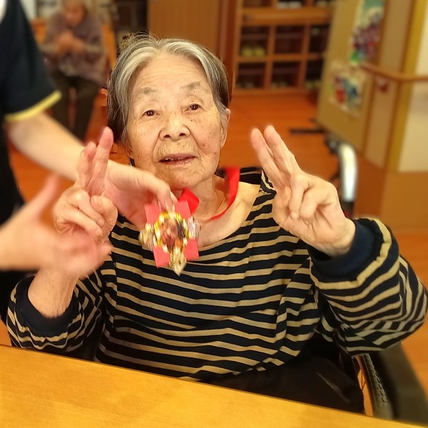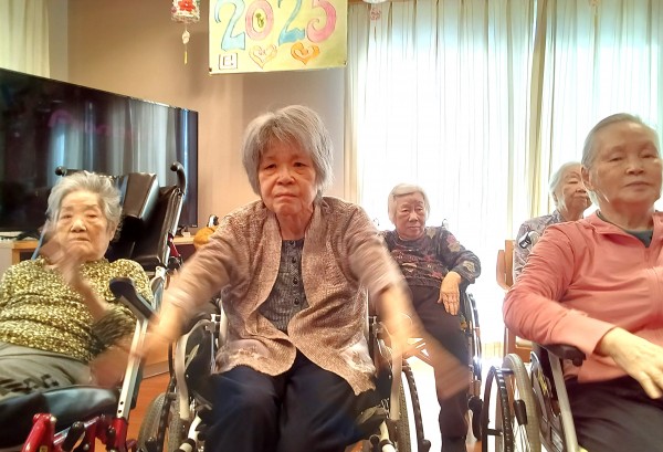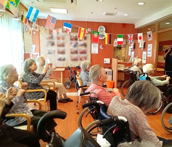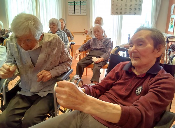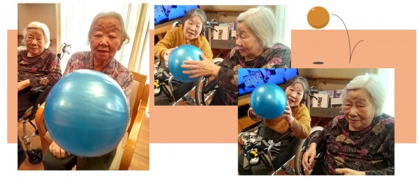 ケアスタッフの声に合わせて体をほぐすうちに 自然と笑顔がこぼれます