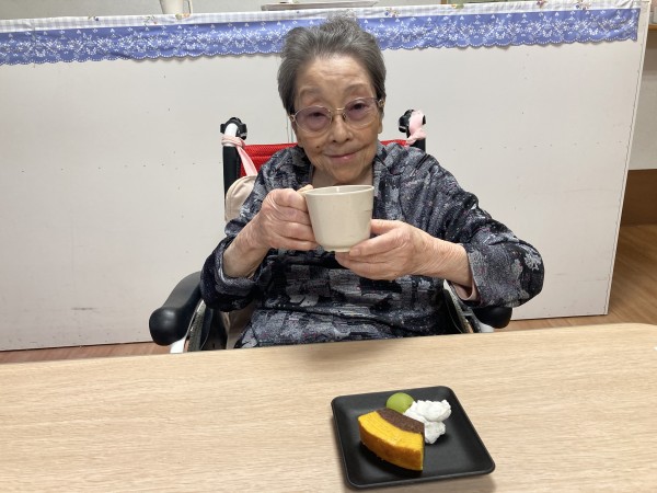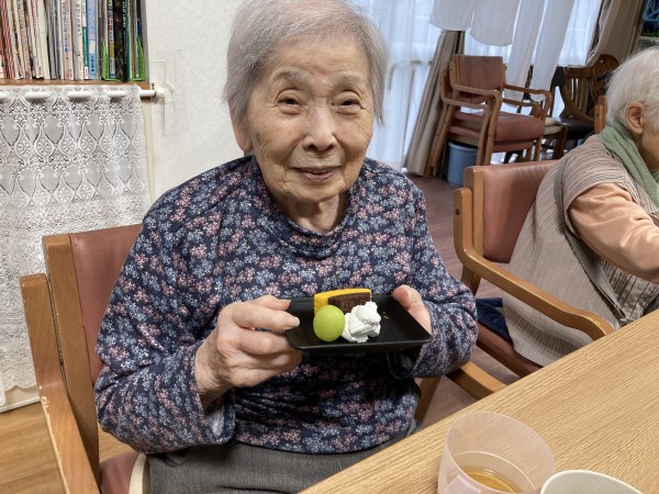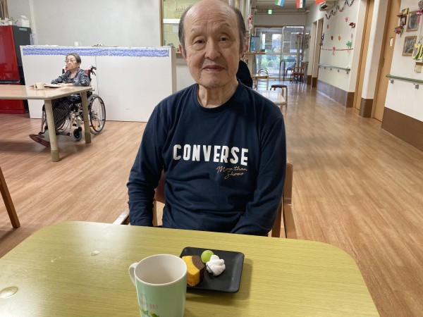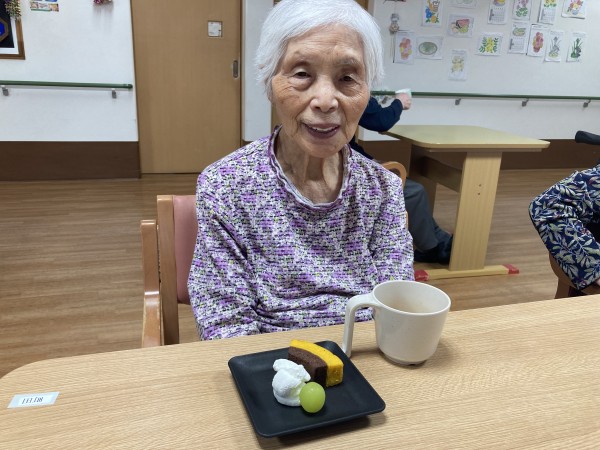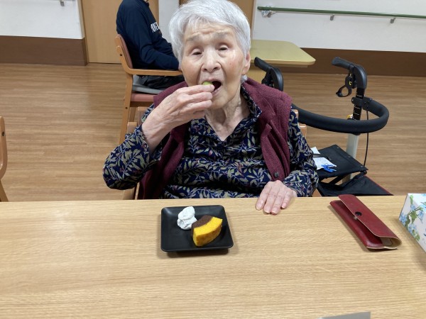 この日のおやつは、カボチャバームと差し入れシャインマスカットに生クリーム添えたもの。お店で出てきそうな見た目。