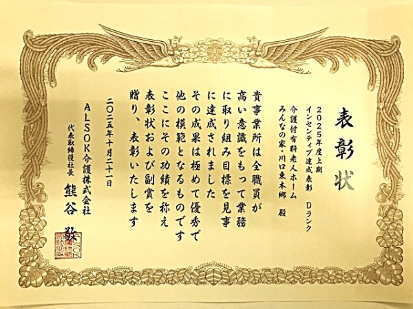 みんなの家・川口東本郷が、ALSOK介護株式会社より(自社です(^^;)表彰されました!!