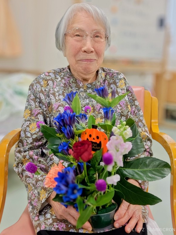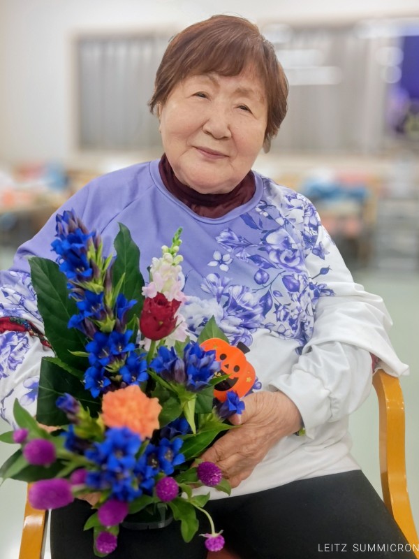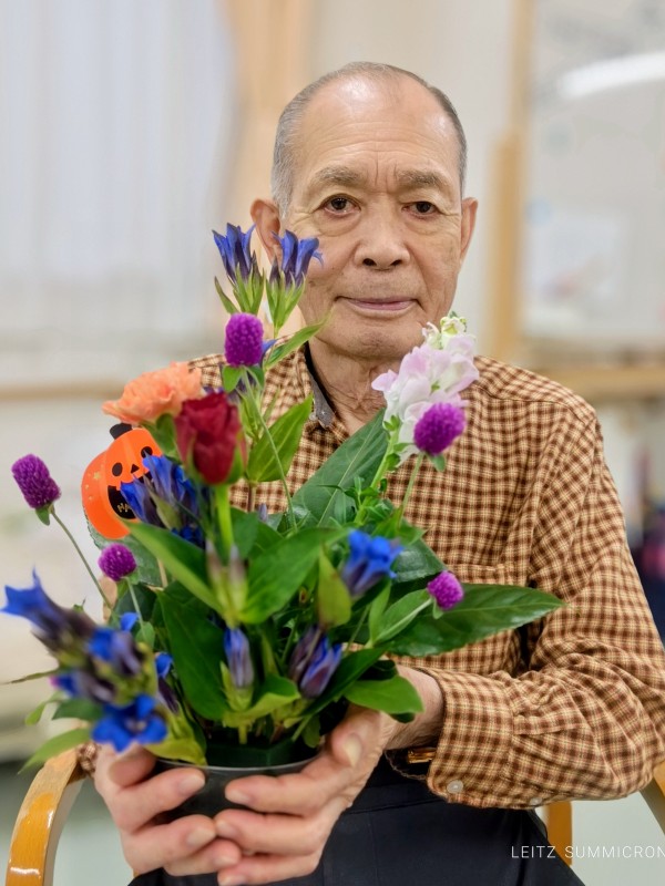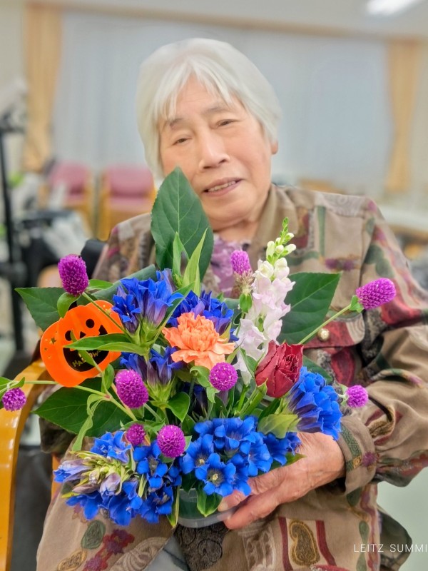 竜胆や千日紅、金魚草にバラ、そしてヤツデの葉を花材に