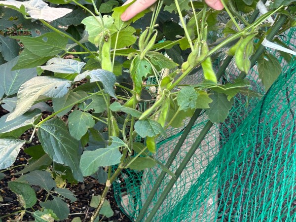 なんと!花壇には大きな枝豆が房をつけて、立派に実っていました。思わず「まだまだ頑張ってるね!」と声をかけたくなるほど、健気に育っています。