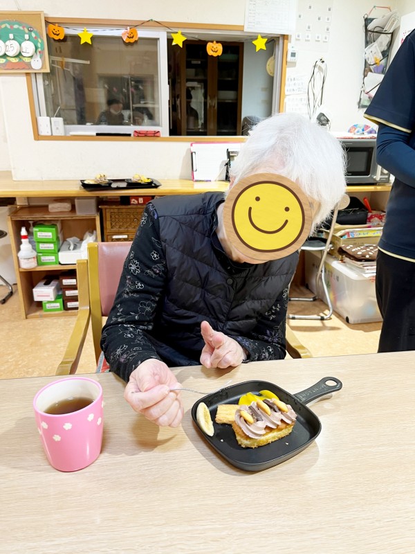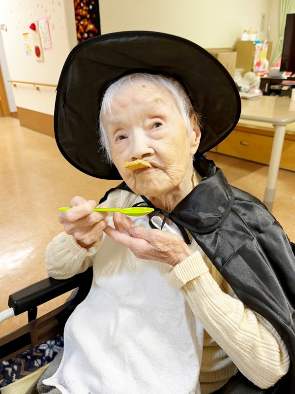 今月お誕生日を迎えられたのはⅯ子様(91歳)。職員よりささやかなお祝いの色紙を送らせていただきました。そして「お誕生日の抱負を一言お願いします。」とお伝えするとⅯ子様はにこやかに「これからも健康で、みんなと仲良く暮らしていきたいです。」とお話しくださいました。その優しい言葉に温かい拍手が起こりました。そして、ハロウィンが近いこともあり、K子様とY様は魔女の帽子とマントを身にまとい、かわいい仮装で参加。お二人は「ハッピーバースデー♪」の歌を大きな声でノリノリに歌ってくださり、笑顔と笑い声でいっぱいになりました。ケーキを配ると、「これ今作ったの?美味しそう!」とⅯ子様。一口食べて「美味しいねぇ」と笑顔を見せてくださいました。Y様はフォークを手に嬉しそうにぱくり!K子様は「わぁ~すごい!美味しそう!」と目を輝かせながら、黙々と味わっておられました。O様は1番に食べ終わると満足そうな笑顔。(*´▽`*)