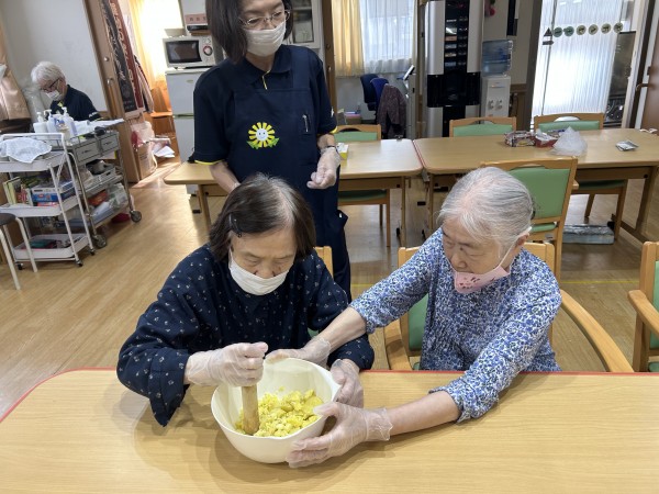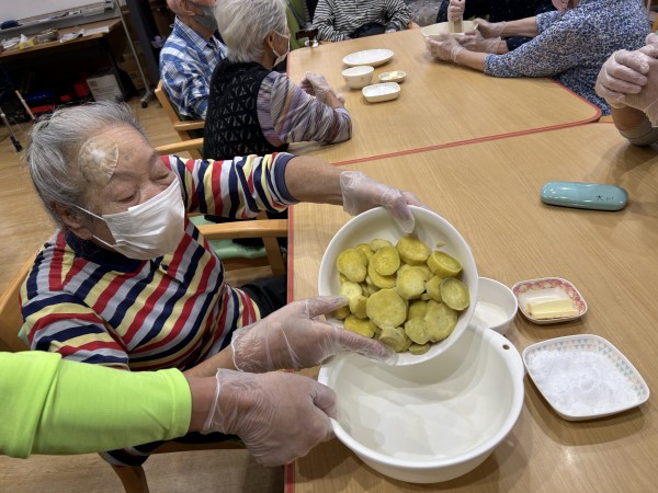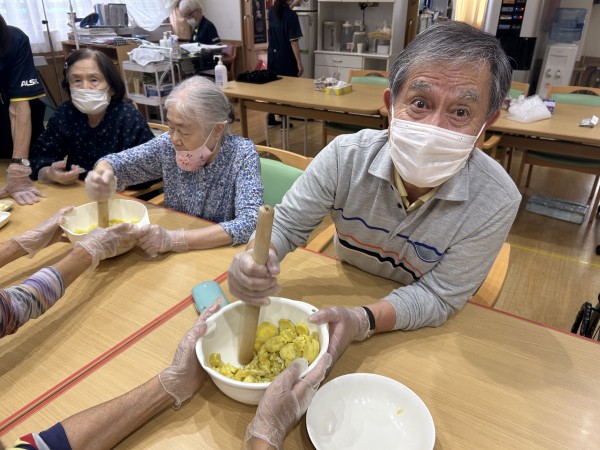 2キロのさつまいもを茹で、みんなで分担してしっかりと潰していきました。潰すのは、得意よ!とニコニコしている方や疲れたから代わって!と隣に早く回す方・・・皆さんとにかく楽しそうでした(๑˃̵ᴗ˂̵)
