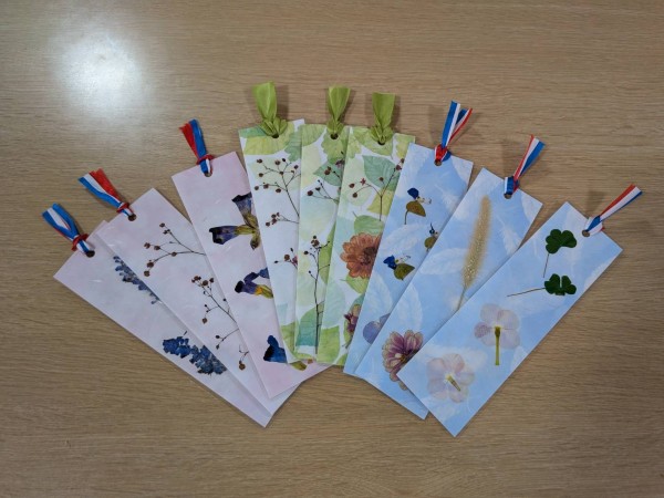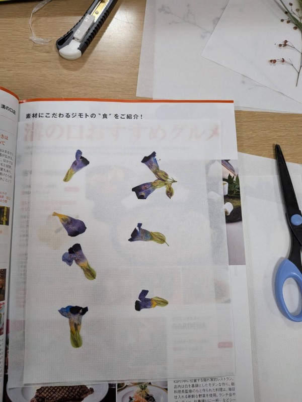 皆さんが選んだ花をしおりに乗せてラミネートをかけます。