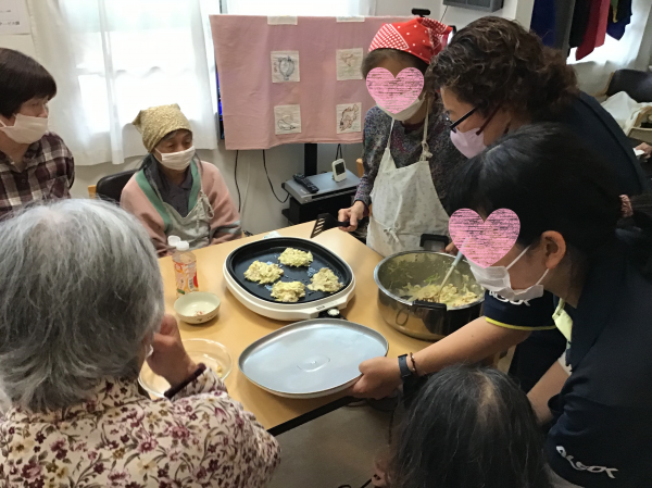 見学に来て下さった方もお好み焼きを焼いて下さり、焼き上がりまでみんなで見守ります。