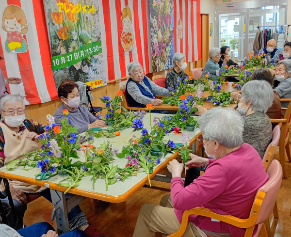 今回は、先日、1階デイサービスにて行なわれた、「フラワーアレンジメント」の様子をお伝えします。