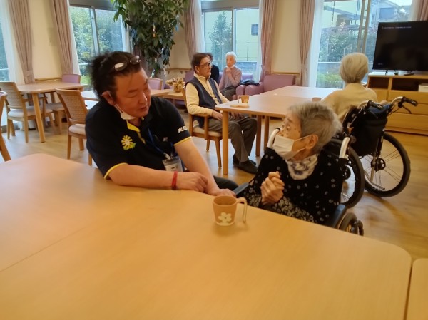 少ない男性ご利用者様同士で「こんにちは」と話したり。