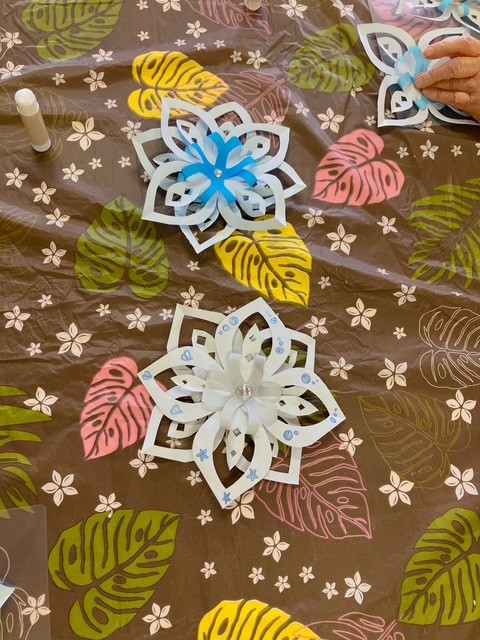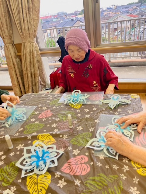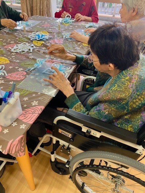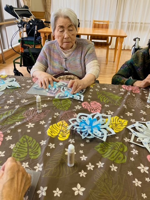 1階の利用者様は雪だるま、2階ではポインセチア、3階では雪の結晶を作りました