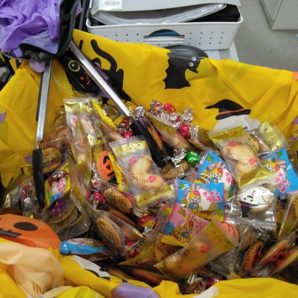 スタッフが仮装をしかわいいお菓子を箱に詰めて回りました