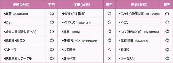 医療的ケアが必要な方の受入が可能となります。(一例ではありますが、下記の症例や状態の方の受入が可能です。)
